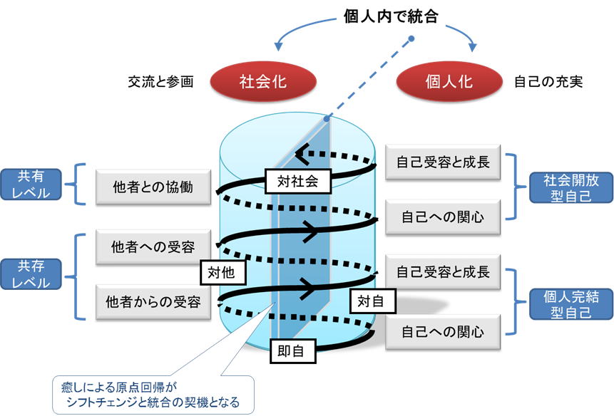 このスパイラル自体は連続的なプロセスであるが、本図を個人化支援の視点(右側)のみから見た場合は、ついたての裏は見えず、個人化プロセスに戻ってきたときだけ、その成長を「自己の充実」(人格の完成)の側面から見ることができる。社会化支援の視点(左側)のみから見た場合は、逆に、個人の自己への関心と自己受容のレベルアップの様子を見ることはできないが、共存から共有への社会形成者としてのレベルアップの側面から見ることができる。これらのいわば「断続的観察」が、図に示したようなスパイラルとしての理解により、「連続的観察」ができるようになると考えたい。(自著「個人化の進展に対応した新しい社会形成者の育成―キャリア教育及び青年教育研究の視点から」『日本生涯教育学会年報』2012年)