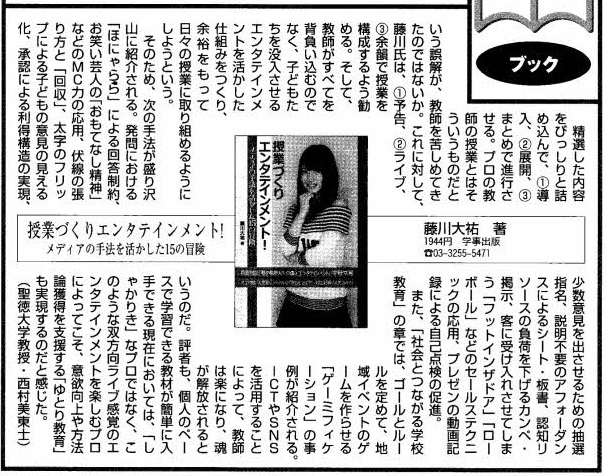 「ほにゃらら」発問による回答制約、お笑い芸人の「おもてなし精神」などのMC力の応用、伏線の張り方と「回収」、太字のフリップによる子どもの意見の見える化、承認による利得構造の実現、少数意見を出させるための抽選指名、説明不要のアフォーダンスによるシート・板書、認知リソースの負荷を下げるカンペ・掲示、客に受け入れさせてしまう「フットインザドア」「ローボール」などのセールステクニックの応用、プレゼンの動画記録による自己点検の促進。また、「社会とつながる学校教育」の章では、@ゲストを招いて、教師はコーディネーター役を務める、A地域からの「正式な依頼」を受けて、地域社会に貢献する、B大人の力を借りて、子どもが他人任せにせずに問題を解決する、などの方法も紹介される。最後に、ゴールとルールを定めて、地域イベントのゲームを作らせる「ゲーミフィケーション」の事例が紹介される。このようにICTやSNSを活用することによって、教師は楽になり、若い魂が解放されるという。教師が楽であること、楽しいこと、それが良い教育の条件であるし、良い教員を集める条件でもあると評者も考える。