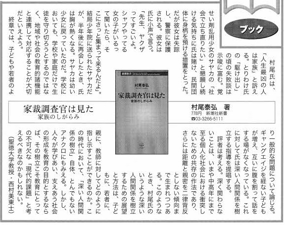 とりわけ村尾氏が「駆け出し」の頃の失敗談が示唆に富む。覚せい剤乱用少女のサヤカは、家庭の状態が悲惨なため、少年院送致が妥当と思われた。しかし、氏はサヤカの「社会で立ち直りたい」と懇願し続ける気持ちに賭け、民間団体に身柄を預ける措置をとった。その後失踪し、頬がこけ、ぼろ雑巾のようになって警察に保護されたサヤカが氏に小声でこう言う。「先生、ヤクザってすごいよ。シャブやってる女の子がいるって聞いたら、そこにさっと集まって来るんだよ。本当にすごいよ」。結局少年院に送られたサヤカだが、半年後に再会したとき、氏は胸が熱くなる。サヤカは幼い少女に戻っていたのだ。学校においても、学校だけで生徒を守り切ろうとするのではなく、社会の教育的諸機能と連携して対応することが大切だと評者は痛感した。