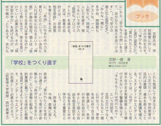 教員免許状更新制については、教員の私費負担を廃するとともに、もっと自由な探究の機会と時間を保障するよう訴えている。そして、行内研修等で対話を通して互いの根っこを掘り下げていけば、「これからも一斉授業を貫く」という先生も、「個別化・協同化・プロジェクト化」に取り組む先生を全否定することはなくなるかもしれないと言う。そして、「そもそもこれは何のため?」という対話を、先生同士だけでなく、子どもたちと一緒に行なって、未来の市民社会の担い手に対して、学校を共に作り合う経験を通して、社会を共に作り合うとはどういうことかを学ぶよう提言する。