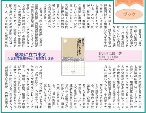 評者は、筆者の重視する人間的な「時間の流れ」の魅力に共鳴しつつも、この「正々堂々」とした東大自負論には多少の違和感を覚えるものである。学歴社会というより、「学校歴社会」の頂点にあったものが東大である。しかし、人の生涯にわたる進展と充実が重視される「学習社会」にあっては、頂点の東大を卒業しても、「賞味期限」は3年程度ではないか。それ以降の人生は、科学知と人文知のスコレーとフォーラムを味わって個人の充実を図り、学び合い支え合いによって社会形成者としての充実を図れるかが、われわれにも青少年にも問われることになるのだと思う。