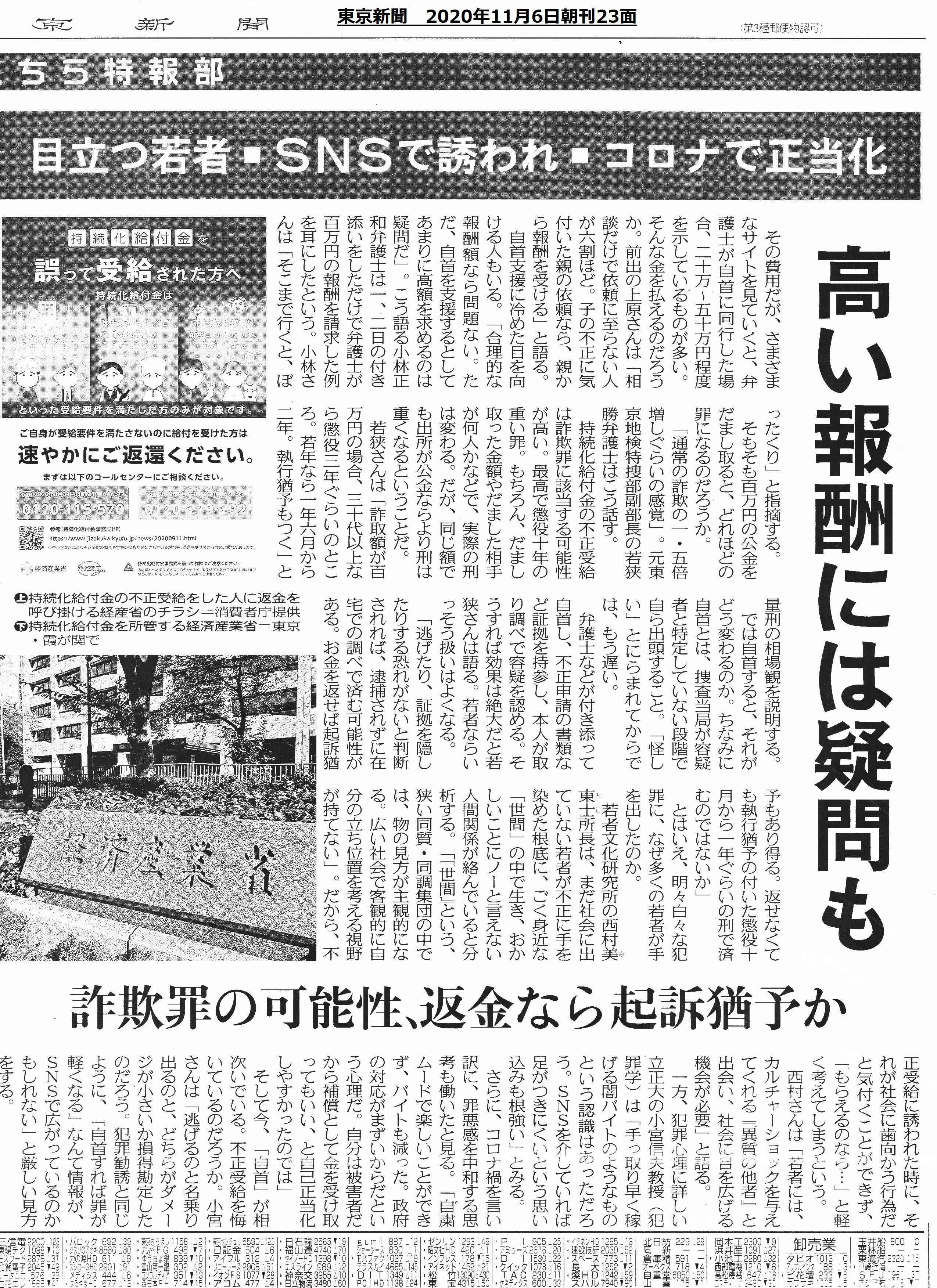 若者文化研究所の西村美東士所長は、まだ社会に出ていない若者が不正に手を染めた根底に、ごく身近な 「世間」の中で生き、おかしいことにノーと言えない人間関係が絡んでいると分析する。 「物の見方が主観的になる。広い社会で客観的に自分の立ち位置を考える視野が持てない」。だから、不正受給に誘われた時に、それが社会に歯向かう行為だと気付くことができず、 「もらえるのなら・・・」と軽く考えてしまうという。